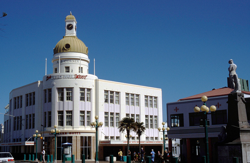 Mitchell, an architectural practice in Wellington. The building is notable for an impressive bowed corner and a fine tower and clock. The unadorned facades have well proportioned fenestration to contrast with the domed clock tower. The T & G Mutual Building is a most significant townscape element on the renowned Marine Parade. Picture taken 1999: ![]() |